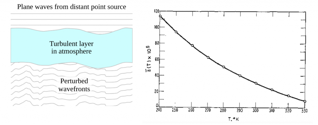 Figure 1 : Because of the wind and the dependency of the air refractive index in function of temperature and pressure (right graph), the transmitted wavefront changes in time (left figure)