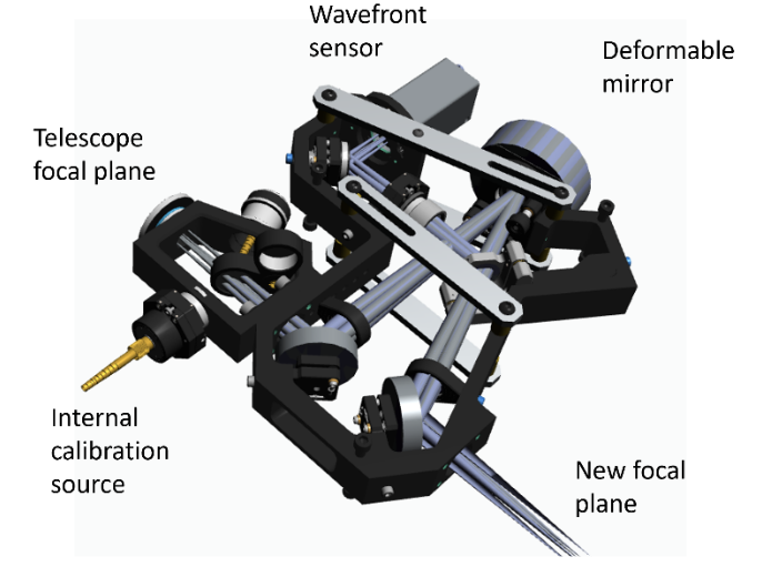 - Includes a fast wavefront sensor, a fast piezo-electric deformable mirror, and a compact optical system for optical relay and beam transportation.