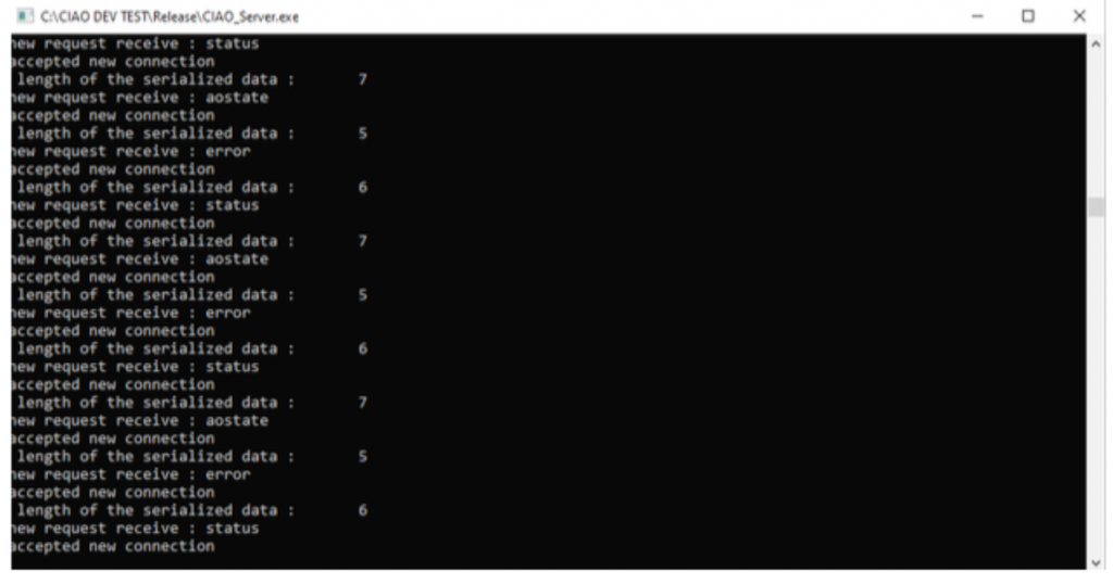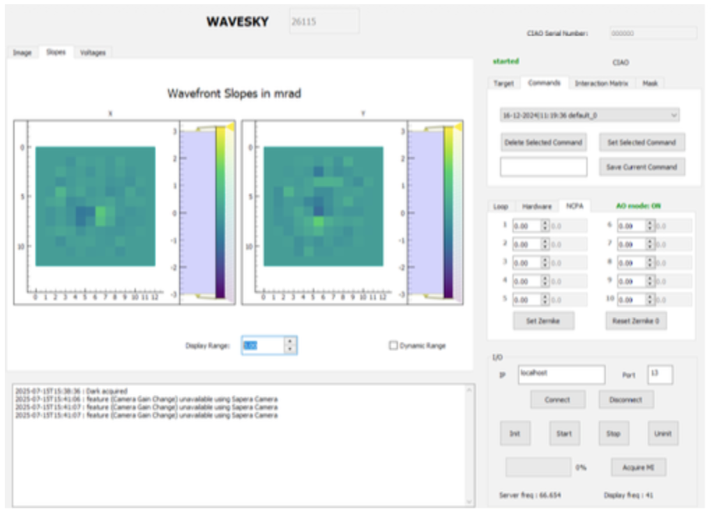 CIAO comes with software allowing the calibration of CIAO and monitoring its operation. The calibration is made using an internal source controlled via the software. The software architecture is based on the association of a server streaming slopes that WaveSky displays; this is to maximize the correction velocity of the system.