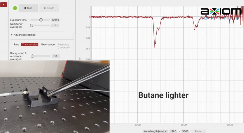 The 2–5 µm spectral region covers strong fundamental vibrational absorption bands of ubiquitous chemical bonds such as hydrocarbons (C–H bonds), water and alcohols (O–H bonds), carbonyl compounds (C=O stretch), and many industrial gases (CO₂, CO, CH₄, etc.) In modern dispersive Mid-IR spectroscopy systems using nonlinear upconversion detection, such as in the NLIR Mid-Infrared Spectrometer, Mid-IR light is converted to shorter wavelengths. Subsequent detection is performed with fast, low-noise silicon sensors, and consequently thermal noise typical of direct Mid-IR detectors is significantly reduced. The result is high-speed, high-sensitivity spectral acquisition without cryogenic cooling.