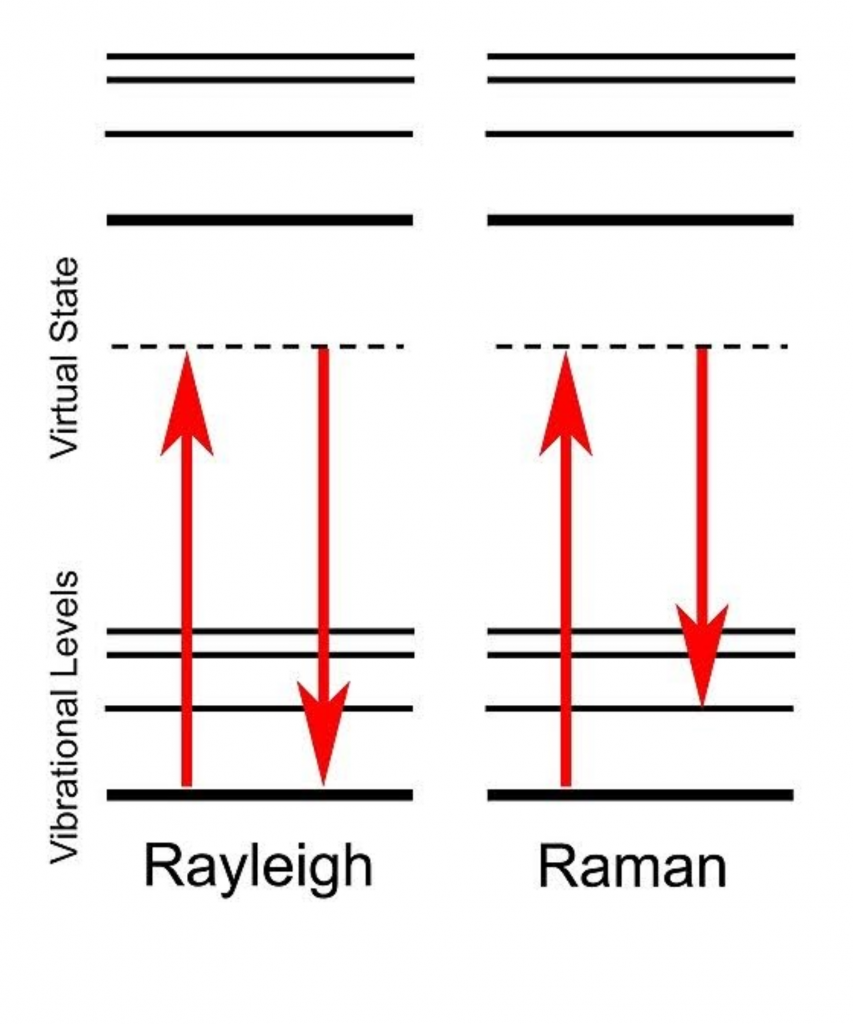 Figure 1. Energy level diagram showing inelastic Raman scattering vs. elastic scattering (Rayleigh).