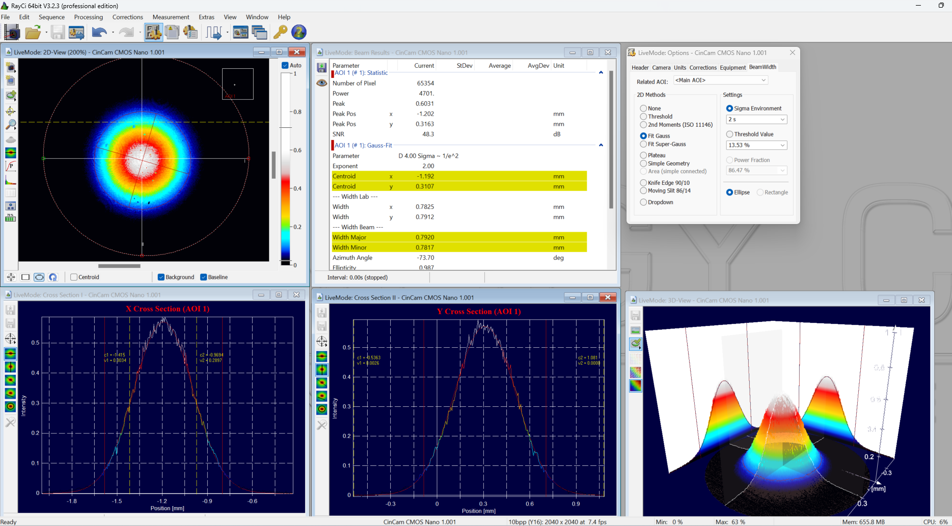 RayCi is a dedicated laser beam profiler software that utilizes newly developed correction algorithms and incomparable visualizations modes. This ensures the highest accuracy in beam profile analysis according to ISO standards. (ISO conformity: ISO 11145, 11146, 11554, 11670, 13694)