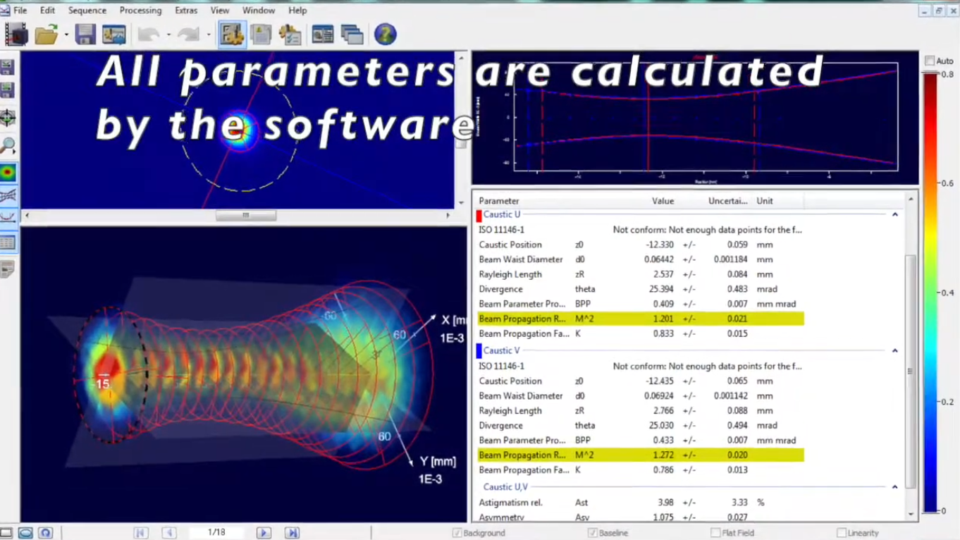 - Focused beam parameters: Waist diameter, Absolute caustic position, Rayleigh Length, M2 values.