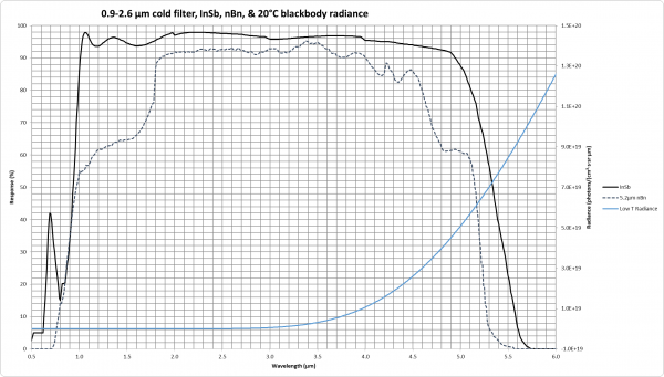 - Broadband spectral response (<1 to >5 µm) with optional cold filter (3-5 µm, CO2, eSWIR or custom)