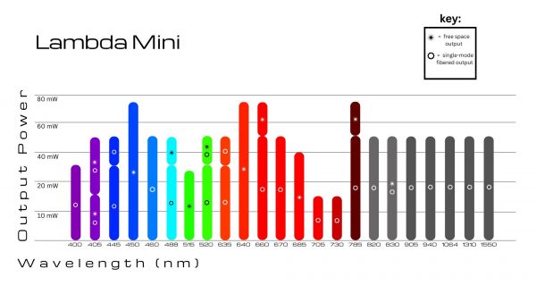 The Lambda Mini laser compact laser module is available in two versions: The Lambda Mini Evo emits a free collimated TEM00 laser beam while the Lambda Mini Fiber couples the beam into an optical fiber. The Lambda Mini Fiber includes an 80 cm single mode optical fiber with an FC-PC or FC-APC connector. The fiber is factory-aligned and permanently attached. Polarization-maintaining or multi-mode fibers are optionally available.