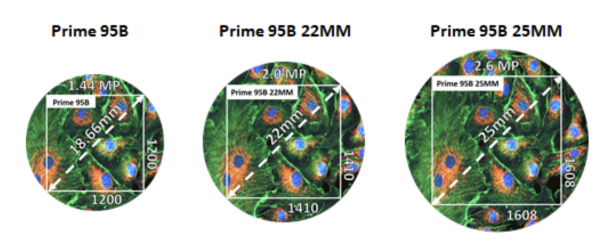 The Prime 95B is offered with an 18.8, 22 or 25 mm diagonal field of view. The larger format sensors are designed to increase throughput, maximize data capture and take full advantage of new, larger field of view microscopes.