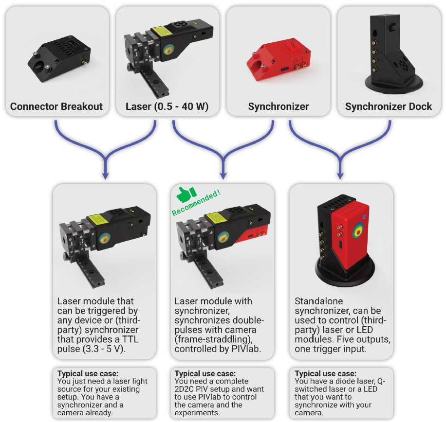 We offer complete PIV hardware for PIVlab: pulsed laser diodes, synchronizers, several cameras and a seeding generator, all can be remote controlled directly from PIVlab.